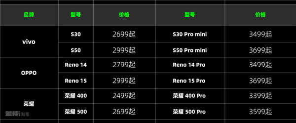 不晓得大师发觉没有,本年各大手机厂商的 “ 线下机 ” 几乎是全员跌价了。25年下半年发布的 OPPO Reno 15、vivo S50 还有荣耀 500,起步价遍及比上一代贵了两三百块。