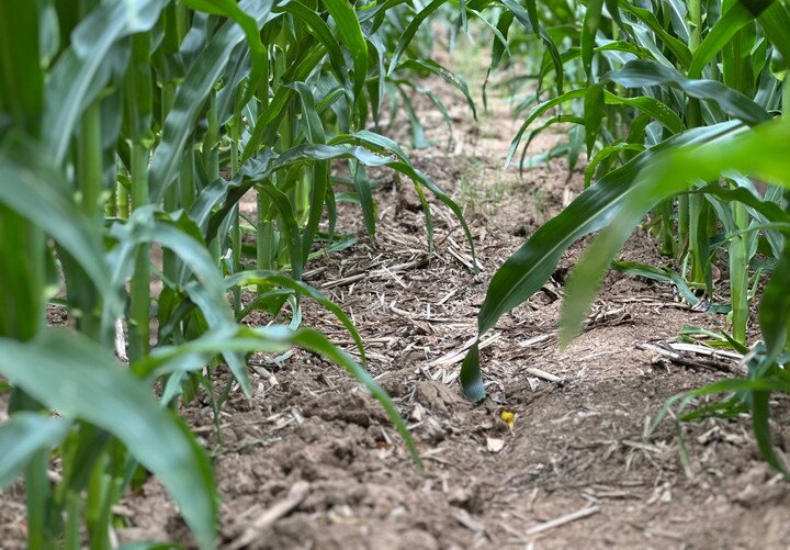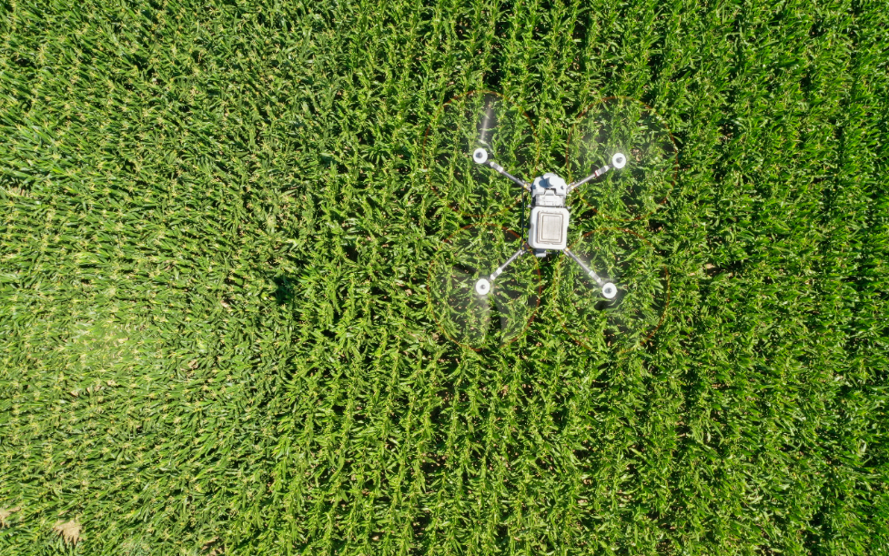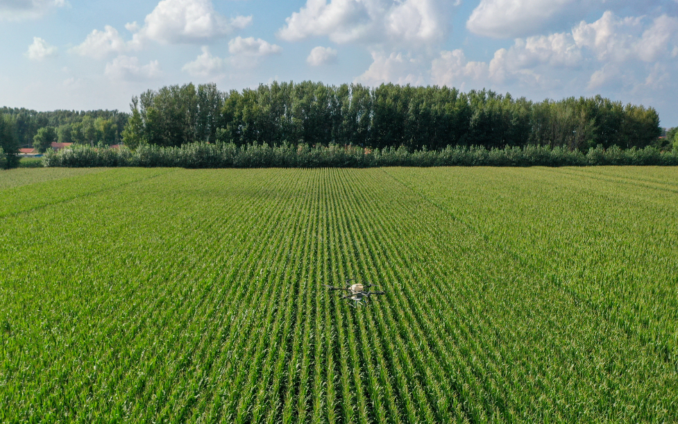 7月21日,正在位于省四平市梨树县的“科技小院”试验田,植保无人机为玉米精准施肥(无人机拍摄)。记者 张楠 摄。