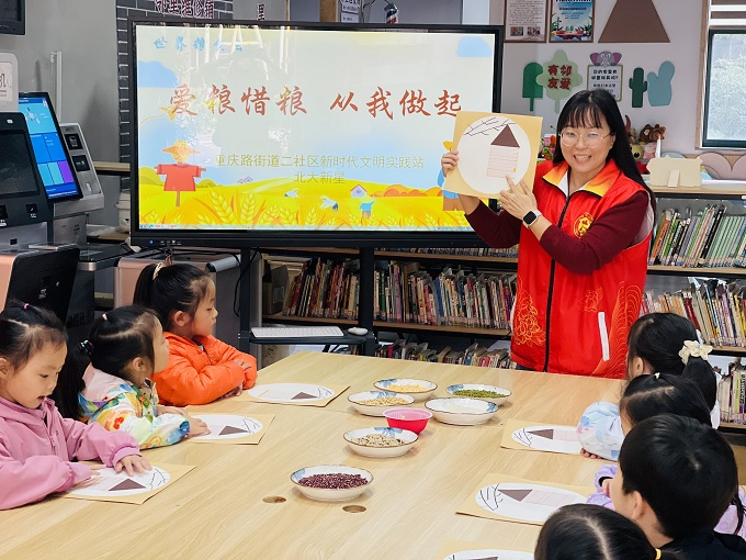 洛阳市涧西区沉庆街道二社区组织开展“爱惜粮食 从我做起”从题勾当。图为小伴侣们认实进修糊口中该当若何做到节粮爱粮。(洛阳市涧西区纪委监委供 宋娣 摄)。