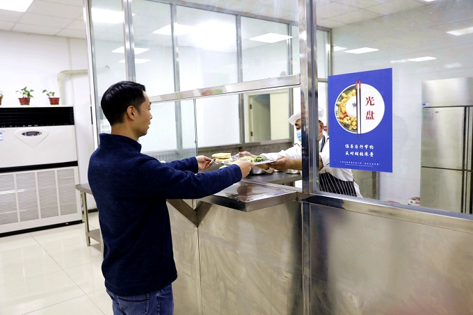 新密市机关事务办理局正在全市机关食堂鼎力“光盘步履”,杜绝舌尖上的华侈,积极指导全市机关干部爱惜每一餐饭、节约每一粒粮。(新密市纪委监委 杨昊 摄)。